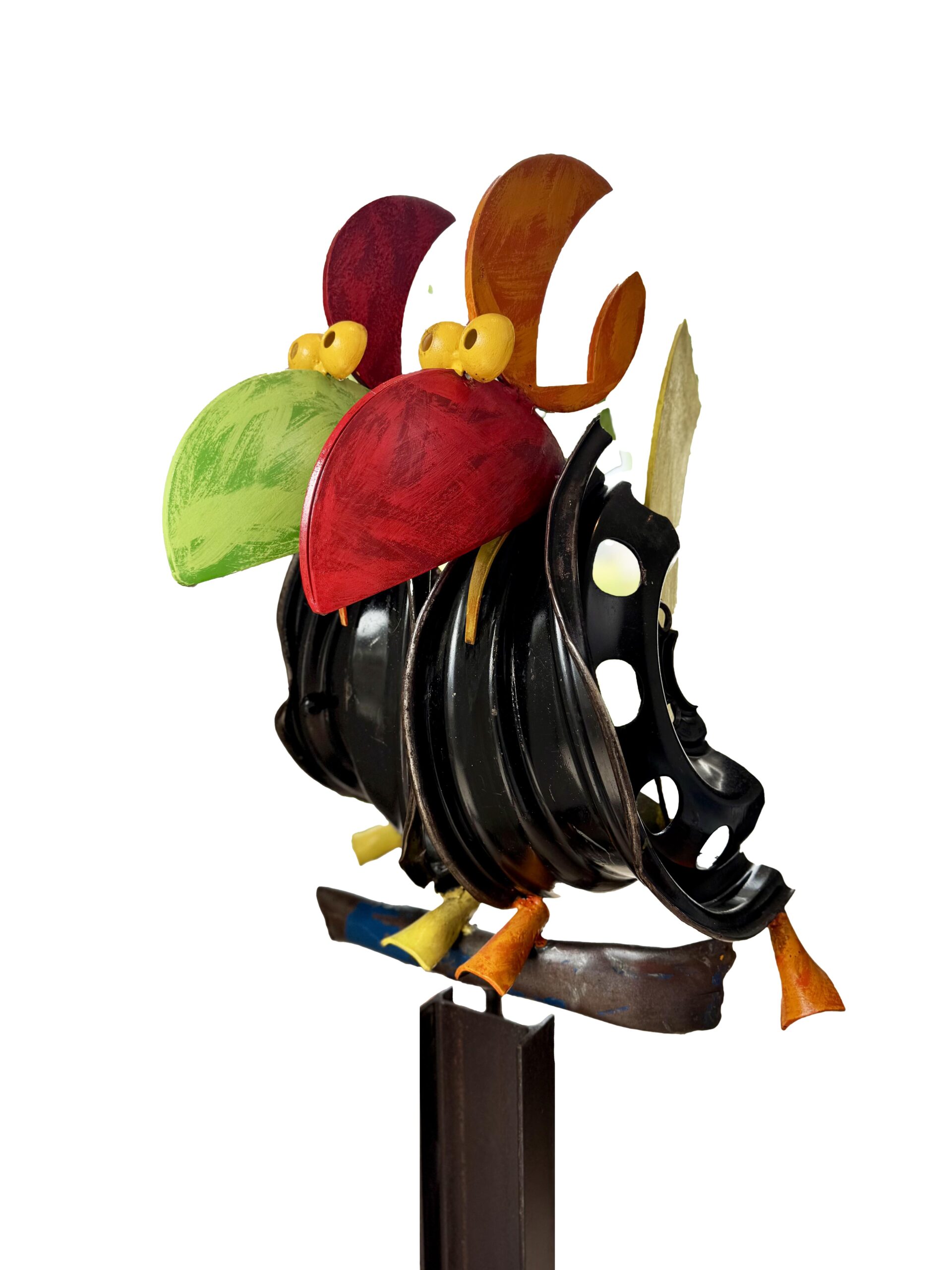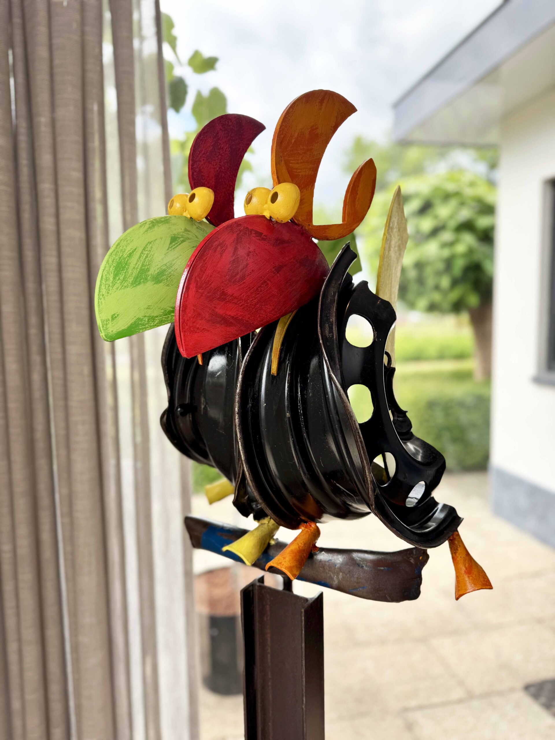 Jörg Ridderbusch is known for his innovative use of recycled materials, primarily steel. He transforms everyday objects such as stair railings into majestic thrones and makes beautiful wings for birds from car rims. By reusing these materials, Jörg gives emotion to what many consider cold and lifeless. He playfully incorporates this chilly material and combines it with colorful fantasy figures that seem to come straight out of fairy tales and legends.