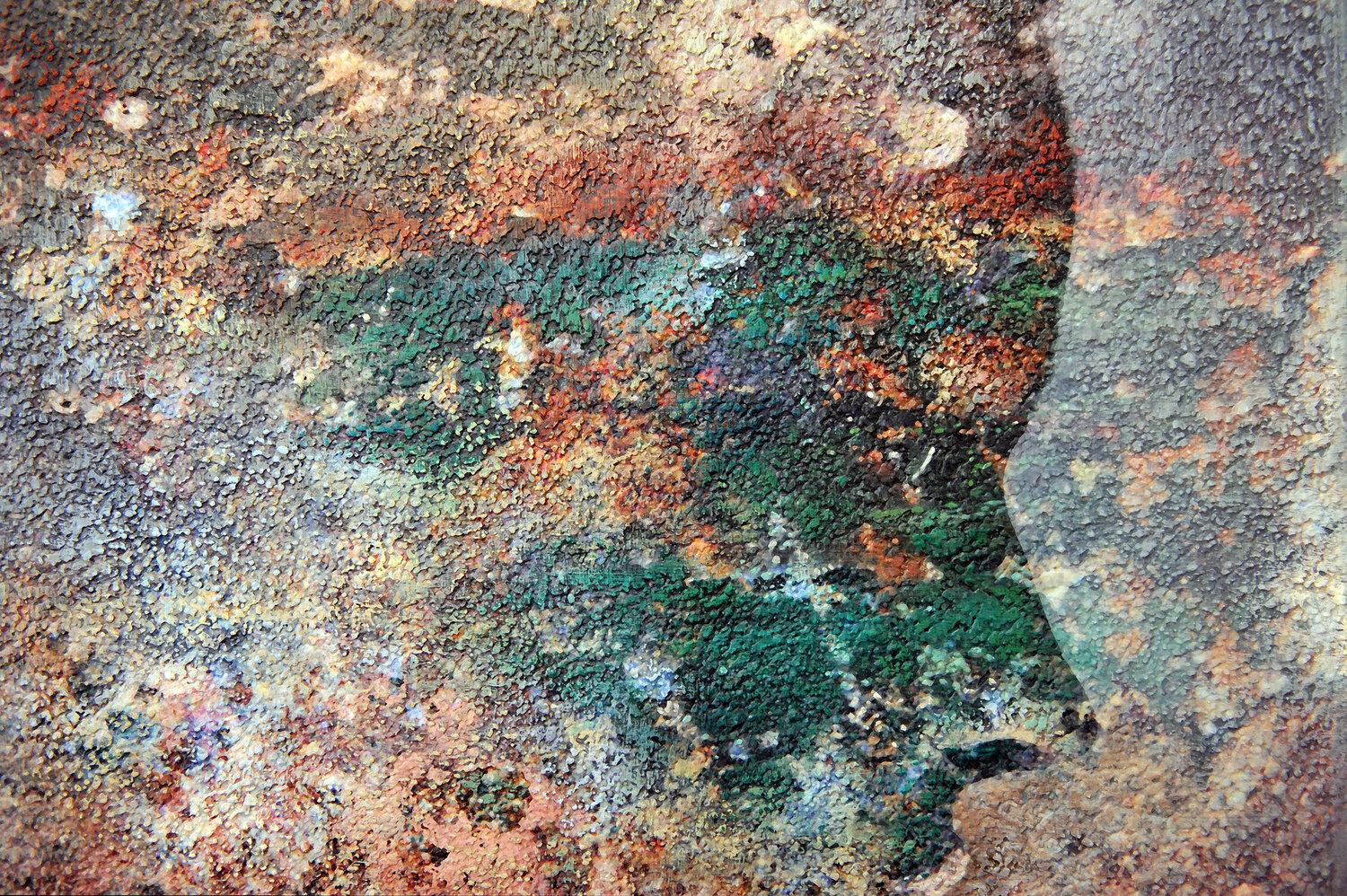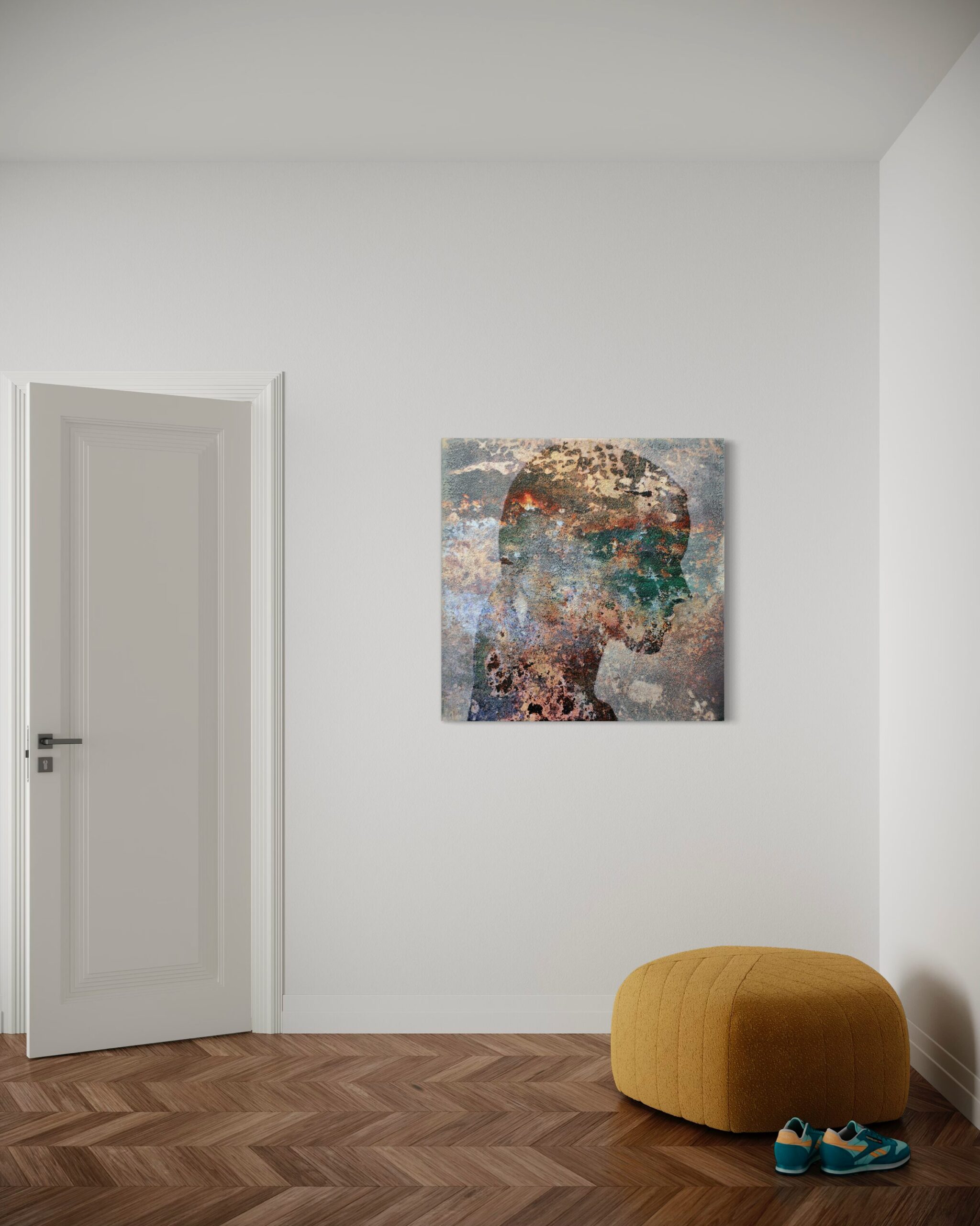 Karin Vermeer: “My work is a mix of different photographs, images and paint that I combine on the computer and canvas to create a new representation. My favorite subject is the female face. I use pictures of people, old walls, grunge posters and all kinds of other interesting subjects to create a new image. Once the digital part is done, the image is printed and I begin to paint over it. I create the artwork with many layers of texture, gels and paints. In this way I try to make the digital image tangible. My work is not so much about explanation and concept; it is a game and everything revolves around the image. I usually start quite blank, but by looking at images that interest me and by mixing them, a new image slowly emerges. All works are made on request in any size. Most of these works are a mix of print, paint, grain gel, heavy gel and matte or glossy varnish. The works are handmade, individually slightly different and in an edition of up to 25 pieces, numbered and signed.”