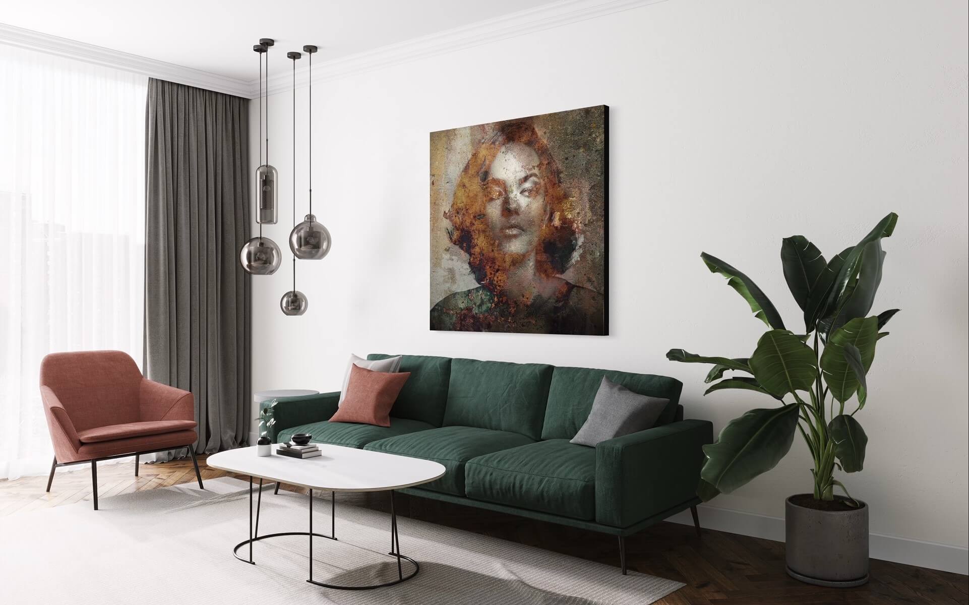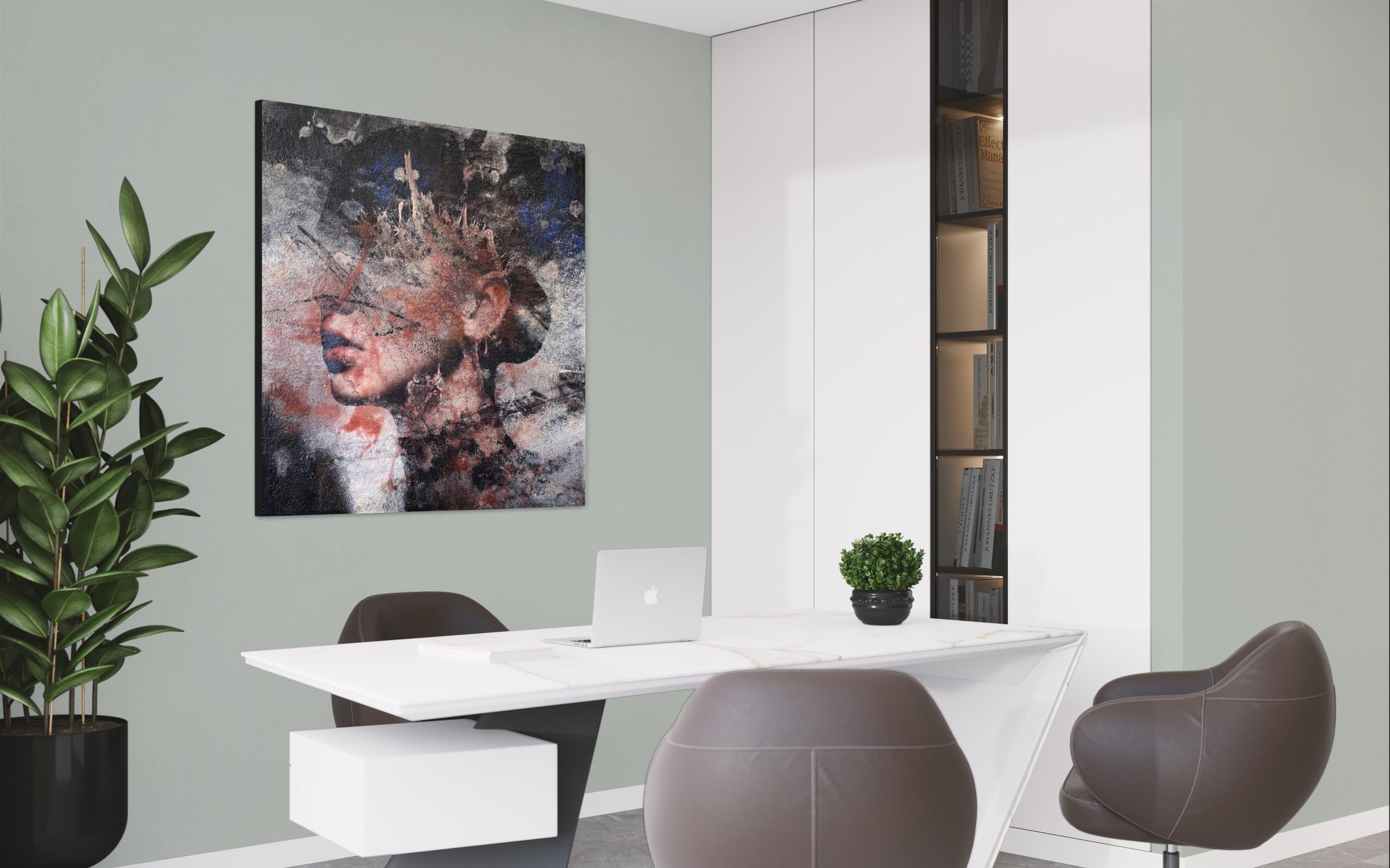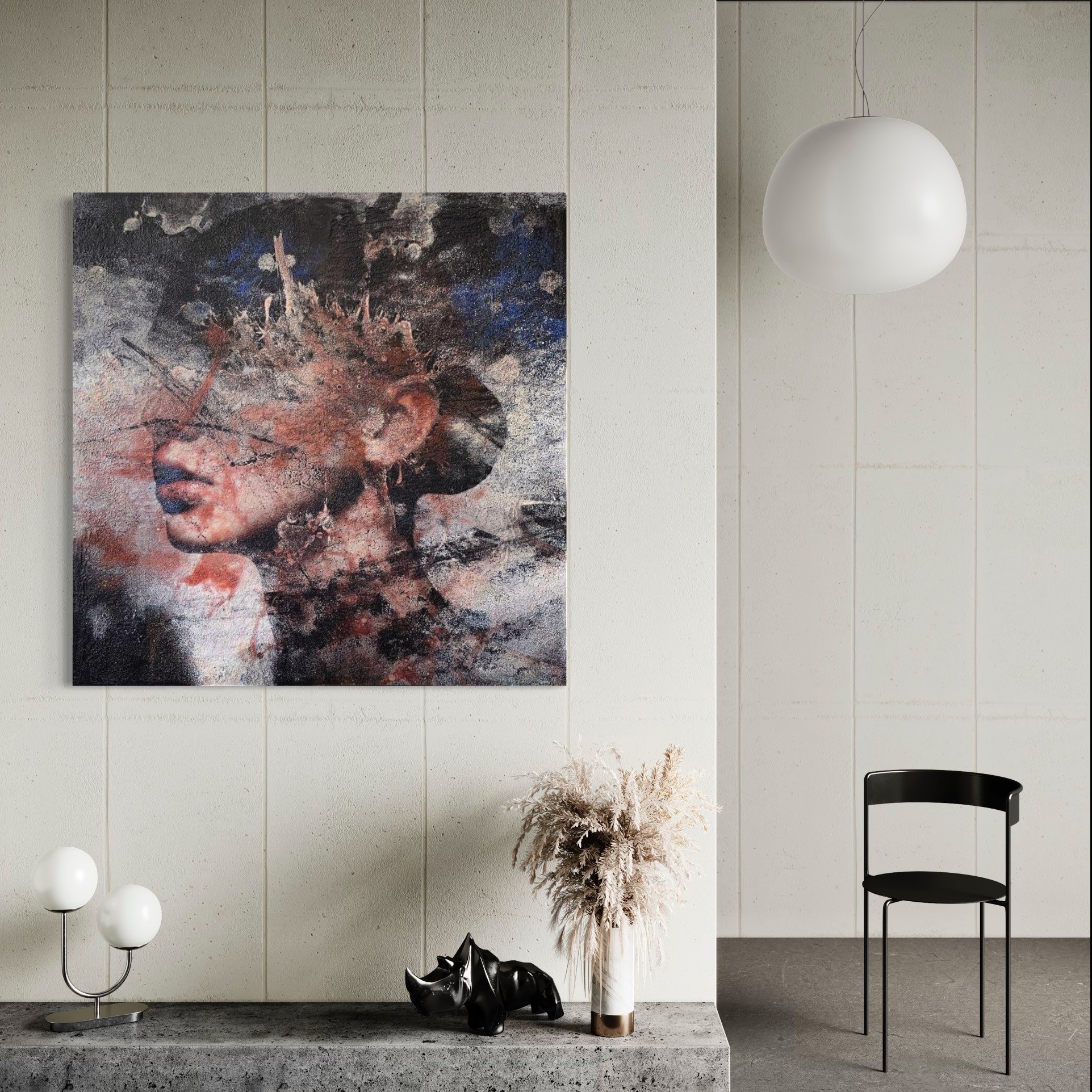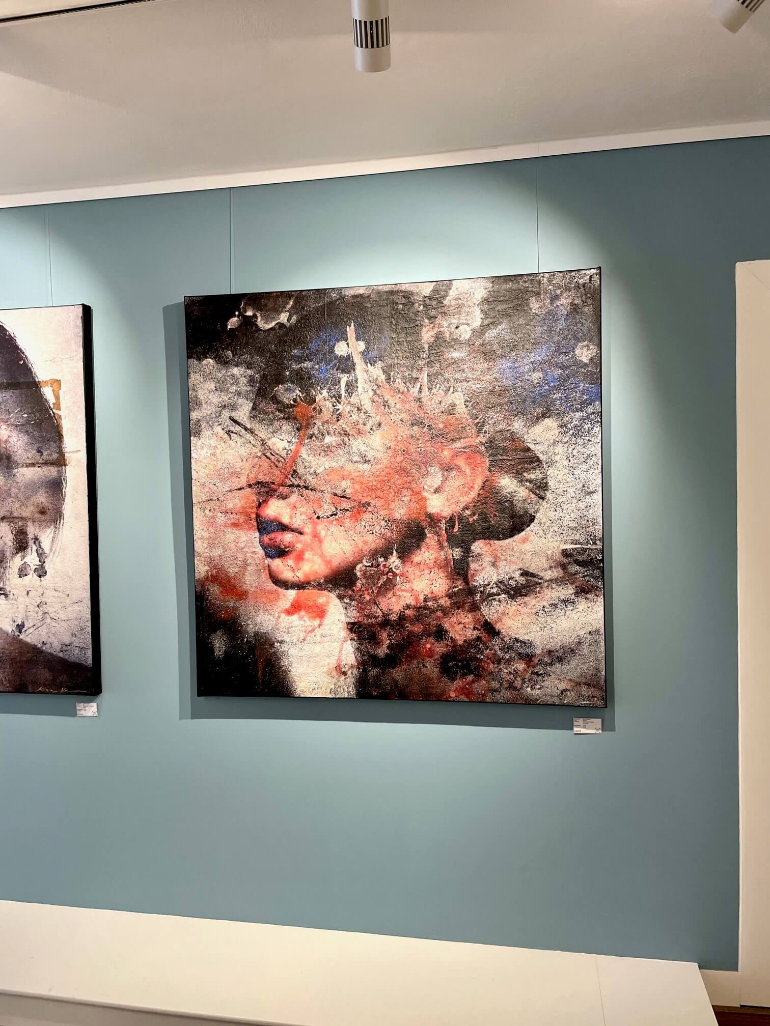 Karin Vermeer: “My work is a mix of different photographs/images and paint that I combine on the computer and canvas to create a new representation. My favorite subject is the female face. I use pictures of people and old walls, grunge posters and all kinds of other interesting subjects to create another new image. When the digital part is finished, the image is printed and I start painting over it. I create the artwork with many layers of texture, gels and paint over it. In this way I try to make the digital image tangible again. My work is not so much about explanation and concept, it is a game and everything is about the image. I generally start out pretty blank, but by looking at images that interest me and mixing them together, a new image slowly emerges. All works are made on request in any size. Most of these works are a mix of print, paint, grain gel, heavy gel and matte or glossy varnish. The works are handmade, individually slightly different and in an edition of up to 25 pieces, numbered and signed.’