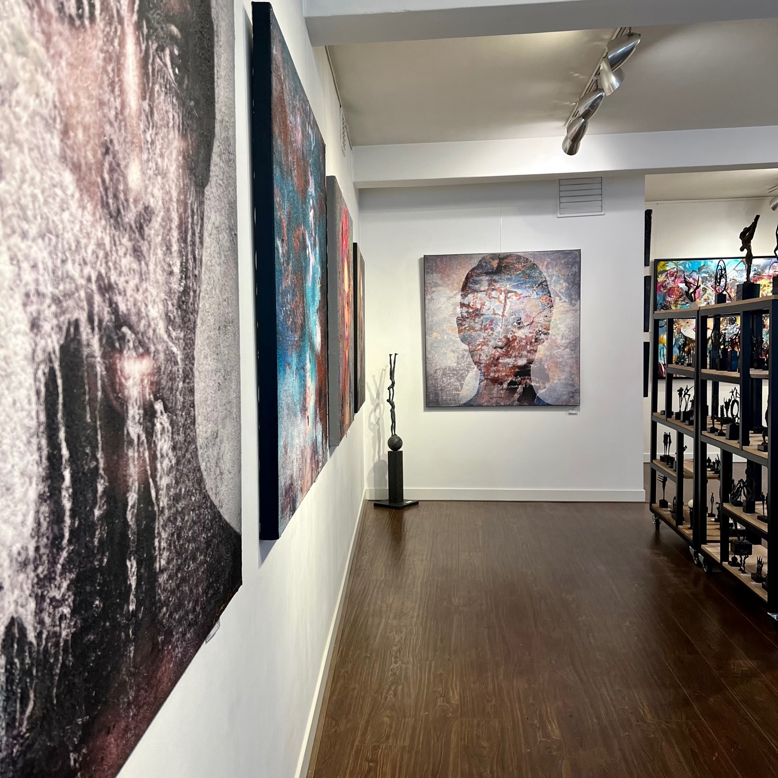 Karin shares her artistic process, “My work is a mix of different photos/images and paint that I combine on the computer and canvas to create a new representation. My favorite subject is the female face, using photographs of people, old walls, grunge posters and all sorts of other interesting subjects to create a new image. Once the digital part is done, the image is printed, then I begin painting. I build the artwork with many layers of texture, gels and paint over it, trying to make the digital image tangible.