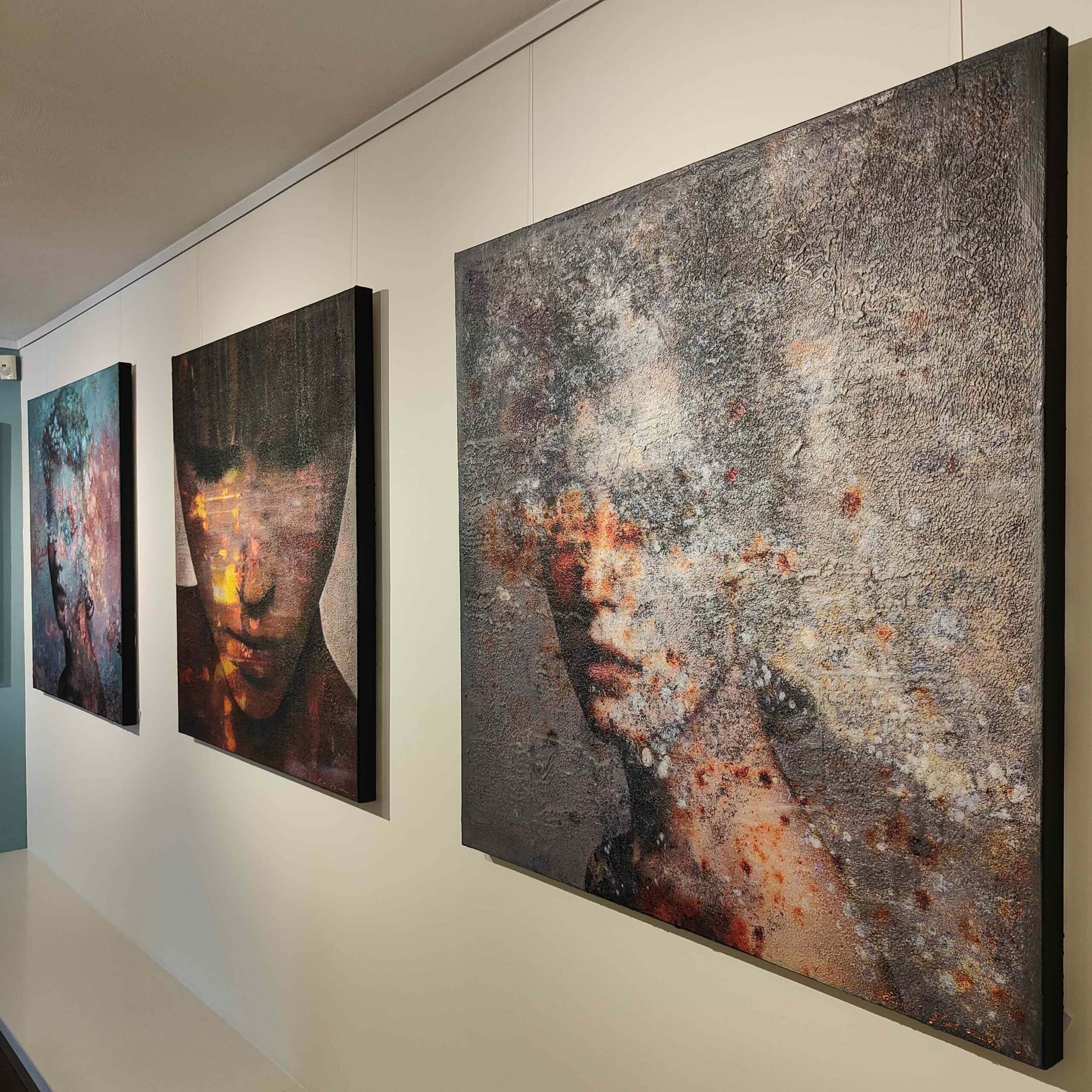 Karin Vermeer: “My work is a mix of different photographs, images and paint that I combine on the computer and canvas to create a new representation. My favorite subject is the female face. I use pictures of people and old walls, grunge posters and all kinds of other interesting subjects to create a new image. Once the digital part is finished, the image is printed and I start painting over it. I create the artwork with many layers of texture, gels and paints. In this way, I try to make the digital image tangible. My work is not so much about explanation and concept, it is a game and everything revolves around the image. I usually start quite blank, but by looking at images that interest me and by mixing them, a new image slowly emerges. All works are made on request in any size. Most of these works are a mix of print, paint, grain gel, heavy gel and matte or glossy varnish. The works are handmade, individually slightly different and in an edition of up to 25 pieces, numbered and signed.’