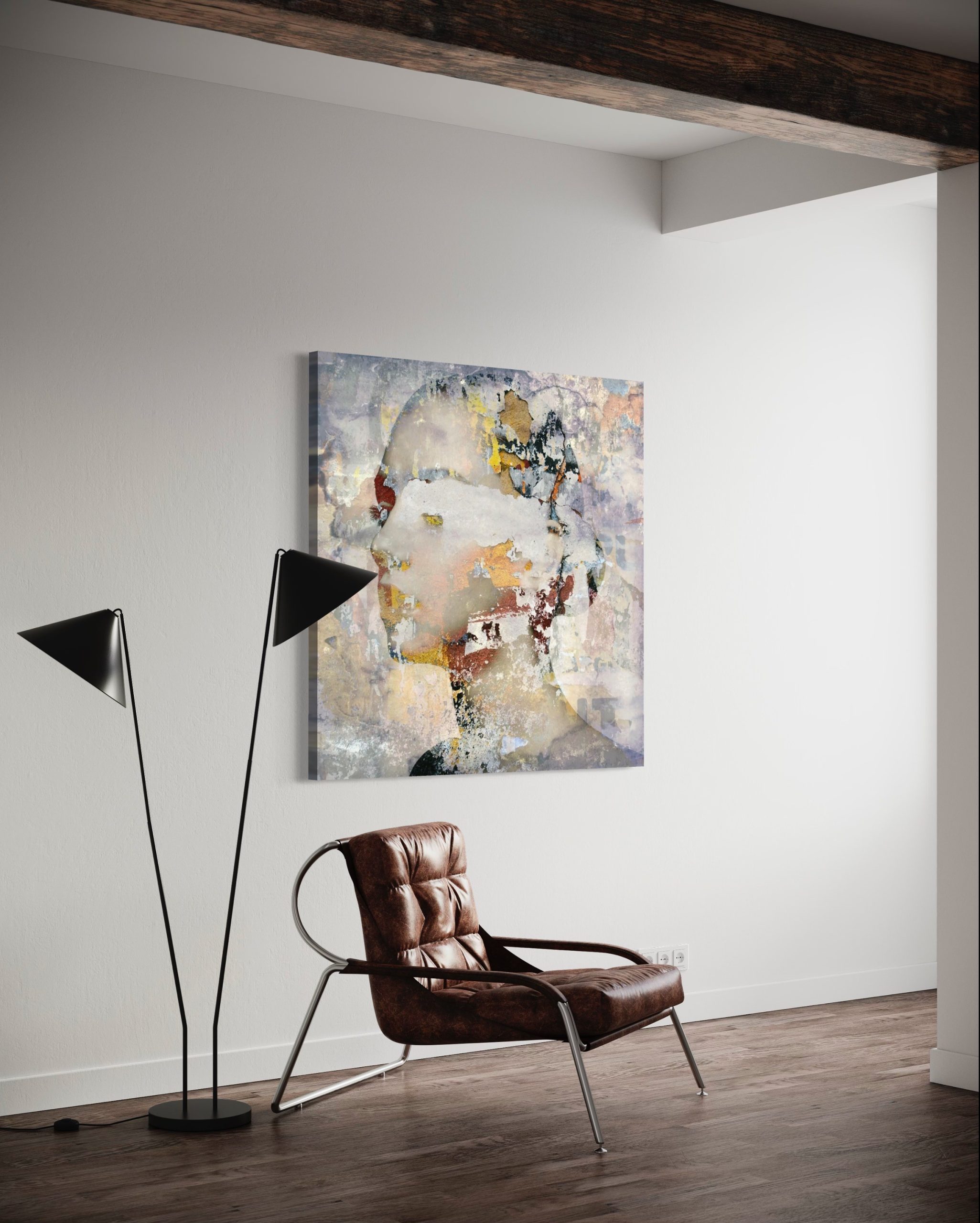 Jasper II is an impressive work of art by Karin Vermeer. The composite photograph of the model creates a particularly beautiful one, making you wonder what the young woman is seeing and why she is keeping a little distance. It is a combination of photographic techniques and acrylic on linen, further enriched with various types of textured pastes, giving the artwork a unique look. The work is stretched on quality linen, with the sides painted through so that it can be hung directly on the wall.
