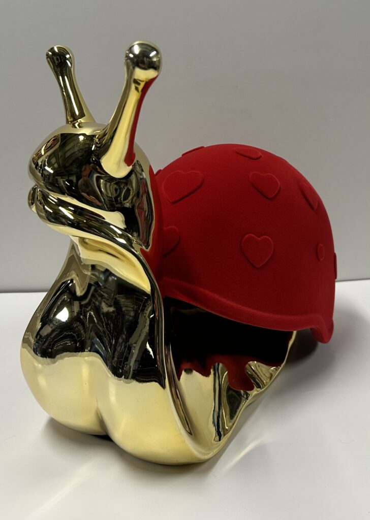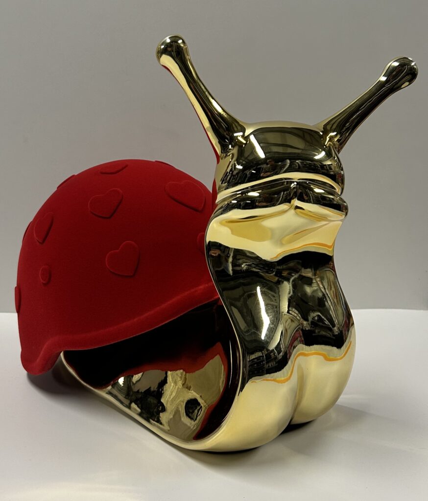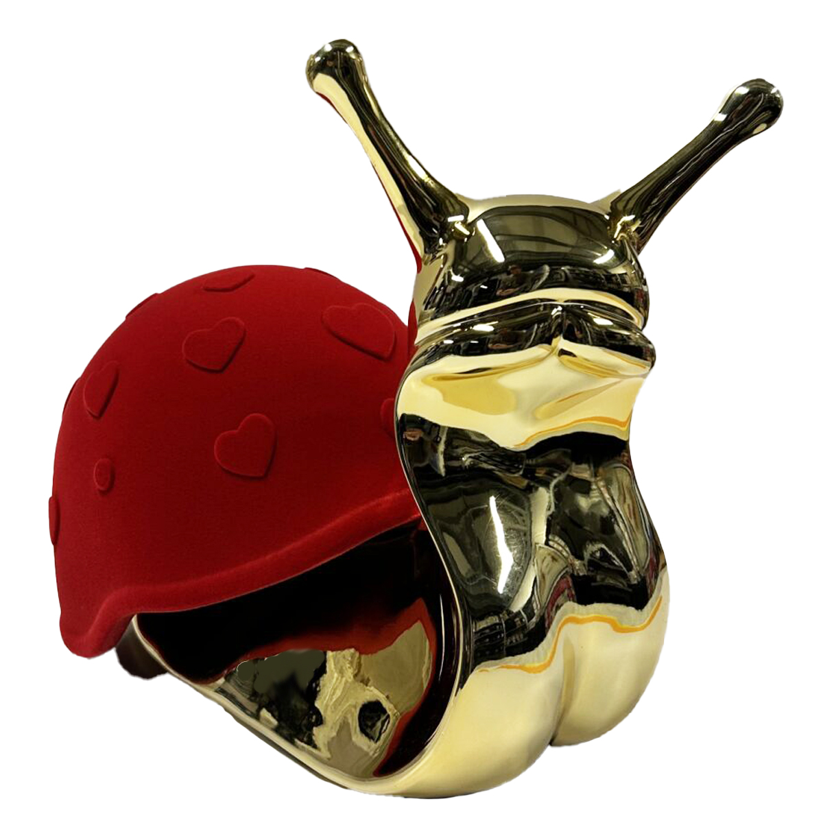 ‘Love Snail Red Gold’ is an amazing PopArt sculpture in the shape of a snail wearing a helmet. This beautiful sculpture is made in a very limited edition of 25 pieces and comes with certificate. The statue is made of high quality polystone that is gold chromed. The helmet is finished with a layer of soft flock containing hearts. This snail is 35cm long and 31cm high.