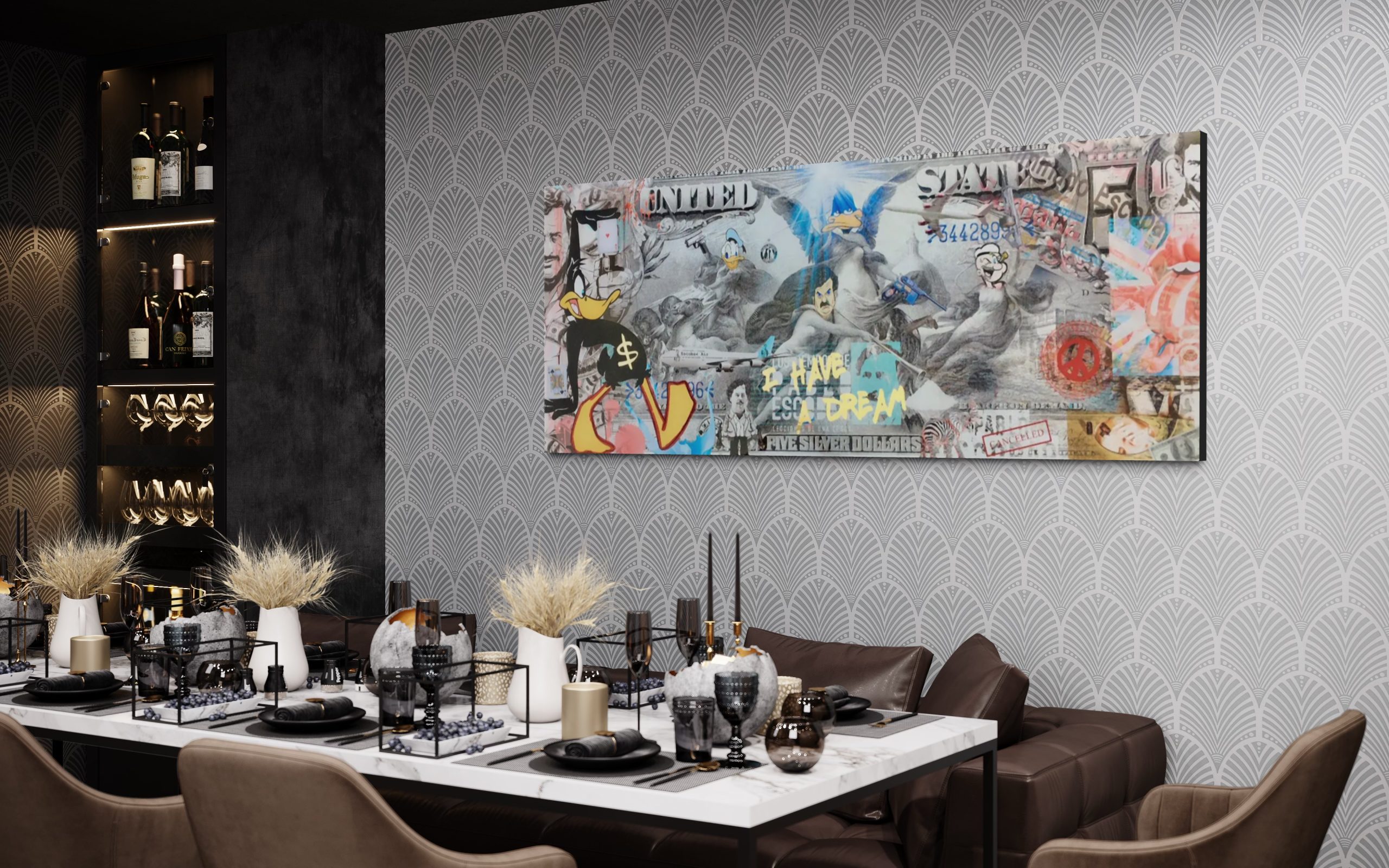 “United States Of Escobar” is a work of art by Van Apple. This artwork is carefully crafted with an array of materials and then covered with a generous layer of epoxy resin, creating a stunning visual effect. This exclusive edition is limited to only 7 copies, each with subtly unique variations. The artwork is securely mounted on a sturdy wooden frame and features a convenient hanging system, making it easy to hang on the wall. And of course, it comes with an official certificate of authenticity.